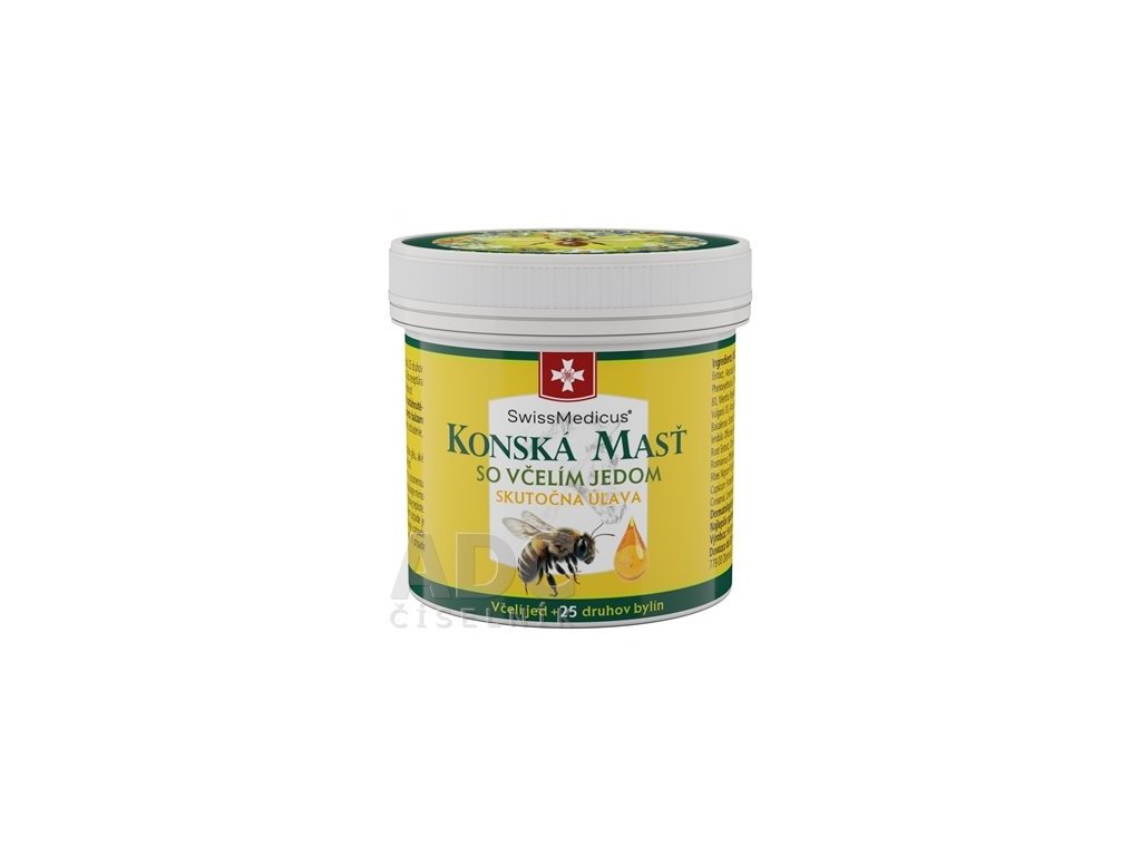 KONSKÁ MASŤ SO VČELÍM JEDOM je unikátny produkt, ktorý spája osvedčený účinok 25 druhov bylín s účinkom včelieho jedu. Včelí jed slúži ako prírodná látka na zníženie citlivosti. Táto receptúra zároveň obsahuje zvýšený podiel bylín, o ktorých je známe, že zlepšujú pružnosť a hybnosť.